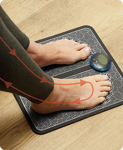 This stimulation boosts blood flow and encourages lymphatic drainage — helping to reduce swelling, stiffness, and fatigue in your legs and feet.